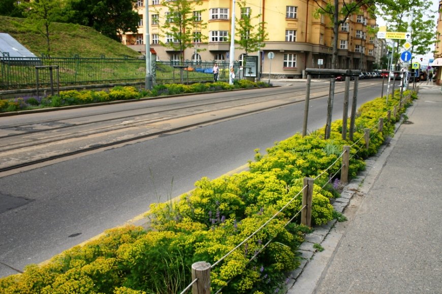 Extenzivní záhon, který není potřeba zavlažovat a který kvete během celé vegetační sezóny. Jedná se o příklad podpory ekologické udržitelnosti ve městě a adaptační opatření.